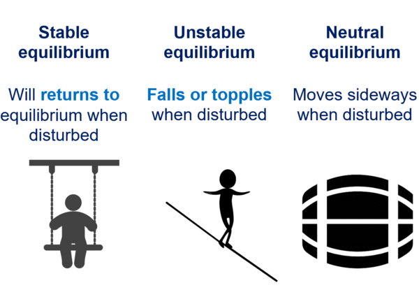 Stable equilibrium is defined 稳定的平衡的定义是 Returns to equilibrium when disturbed 收到扰动能够回到平衡 condition is wider base 条件是底座宽 or pivot above centre of mass 或者支点在质心上 condition is wider base or pivot above centre of mass