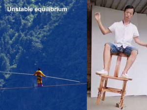Unstable equilibrium is defined 不稳定的平衡定义成 Falls or topples when disturbed 收到扰动的时候翻倒 condition is narrow base 条件是底座窄 or pivot under centre of mass 或者支点在质心下 condition is narrow base or pivot under centre of mass